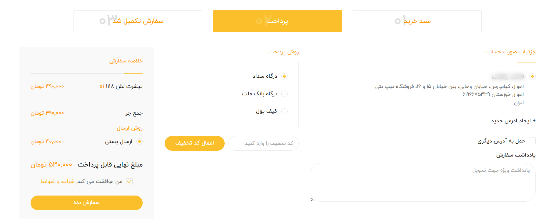 د) در قسمت خلاصه سفارش، می توانید جزییات مربوط به فاکتور خود را مشاهده کنید. با فعال کردن تیک من موافقت می کنم قابلیت کلیک کردن بر روی دکمه سفارش بده ایجاد می شود، و با کلیک روی آن وارد سامانه پرداخت میشوید.